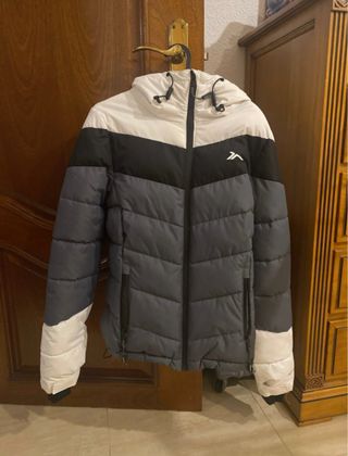 Abrigo acolchado de la marca Décimas, ideal para la nieve. Se encuentra en perfecto estado, casi nuevo. - Diseño con paneles en blanco, negro y gris. - Capucha con cordones ajustables. - Cremallera frontal. - Bolsillos laterales con cremallera.