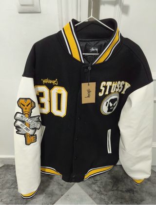 Chaqueta Stüssy con diseño varsity. - Cuerpo principal en color negro. - Mangas en color blanco. - Cuello y puños con detalles a rayas amarillas y blancas. - Parche METALHEADS EST. 2001 en la manga izquierda. - Logo STUSSY bordado en la parte delantera derecha.