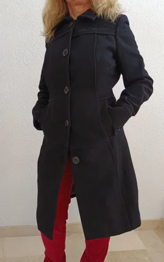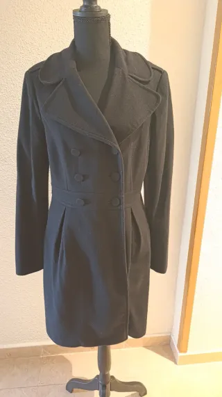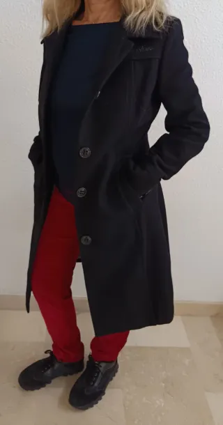 Abrigo de paño en color negro, con un diseño elegante y moderno. Ha sido poco usado y se encuentra en buen estado. - Cierre de botones. - Bolsillos laterales.