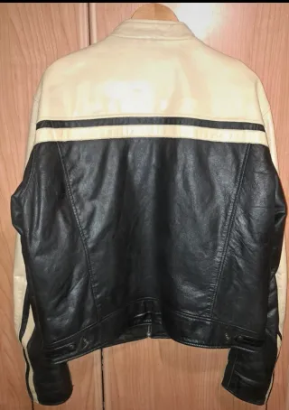 Chaqueta de Piel de Búfalo resistente con un diseño bicolor llevada a tintorería y hidratada. - Paneles en color beige y negro. - Rayas decorativas en las mangas y el pecho. - Cuello redondo con cierre de botón. - Cremallera frontal.