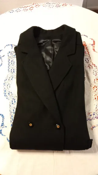 Levita o chaqueta larga impecable. Con buena costura, forro y cinturón. Tiene un movimiento muy fluido y elegante. No se arruga fácilmente. Color negro. He modificado algo las fotos para que sea visible y se aprecie bien. Bolsillos laterales bien profundos (cabría el móvil). Daría para una talla 42 si el brazo es fino. Muy cómoda y viste bien aún con cualquier básico y un collar. Sirve para otoño y primavera que es época de bodas.