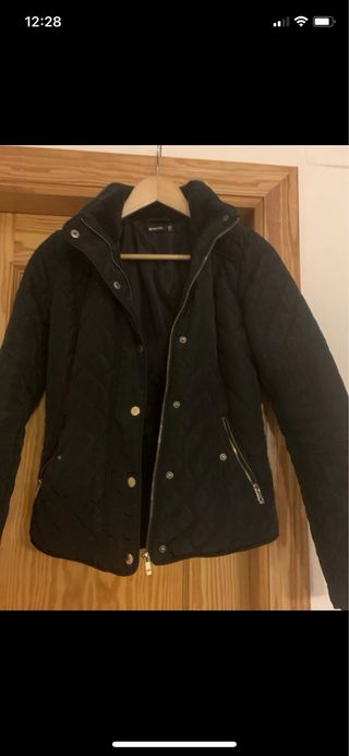 Abrigo elegante de la marca Kiabi. - Color negro. - Diseño moderno con cuello alto. - Dos bolsillos frontales.