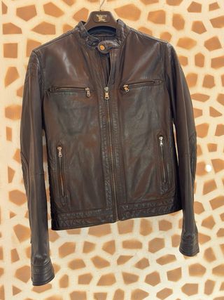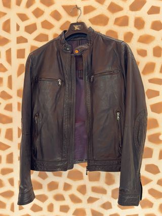 Chaqueta de efecto piel con un diseño moderno y versátil. - Cierre frontal asimétrico. - Bolsillos con cremallera. - Detalle de cinturón en el bajo. -Pequeño desperfecto en la zona del cuello.