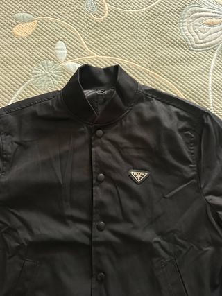 Chaqueta bomber negra de Prada. Presenta un diseño elegante y moderno. - Cierre de botones a presión. - Bolsillos laterales. - Logo triangular de Prada en el pecho.
