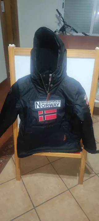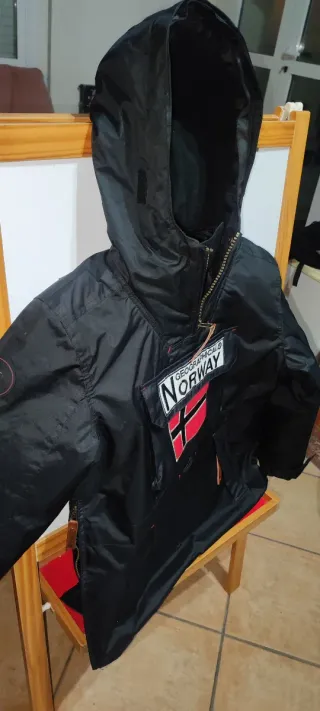 Chaqueta de la marca Geographical Norway en color negro. - Diseño con capucha. - Cierre de cremallera frontal. - Bolsillo canguro en la parte delantera. - Detalle de parche con la bandera de Noruega y texto 'Norway'.