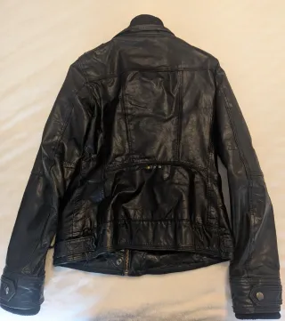Chaqueta de cuero con un diseño moderno y detalles únicos. - Cuello alto con cremallera. - Bolsillos frontales con cremallera. - Puños ajustables.
