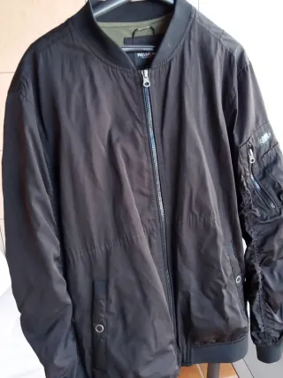 Chaqueta bomber de la marca Pull&Bear. - Color negro con detalles en verde oliva. - Cierre de cremallera frontal. - Cuello redondo acanalado. - Puños y bajo elásticos.