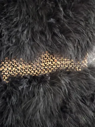 Elegante chaleco con un diseño único y llamativo. - Adornado con detalles dorados en la zona del pecho. - Confeccionado con plumas que le dan un volumen y textura especial. Apenas ha tenido uso.