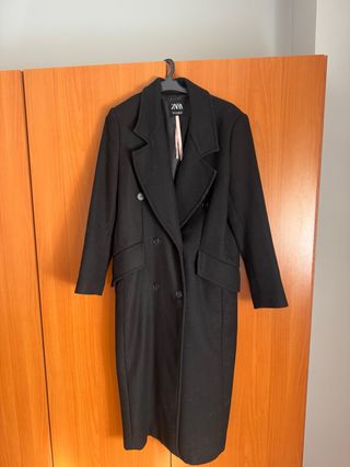 Elegante abrigo largo de Zara en color negro. Un básico atemporal para cualquier armario. - Diseño de doble botonadura. - Cuello de solapa clásico. - Bolsillos frontales con solapa.