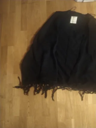 Poncho negro con un diseño elegante y moderno. Ideal para añadir un toque especial a tu atuendo. - Acabado con flecos en el borde inferior. - Tejido suave y cómodo.
