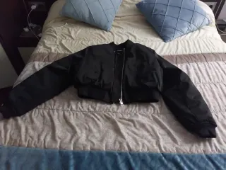 Chamarra corta de color negro. - Diseño bomber. - Dis bolsillos laterales con cierre clip. - Cierre frontal. - Puños y bajo elásticos.
