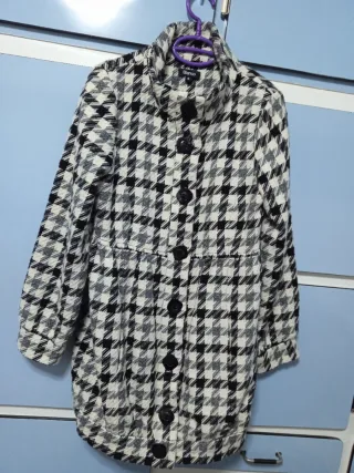 Elegante abrigo de mujer con un clásico estampado de cuadros. - Diseño de cuadros en blanco, negro y rojo. - Cuello solapa. - Cierre de botones. Marca una talla 38 pero talla pequeño Puesto 1vez porque es algo largo y yo soy bajita
