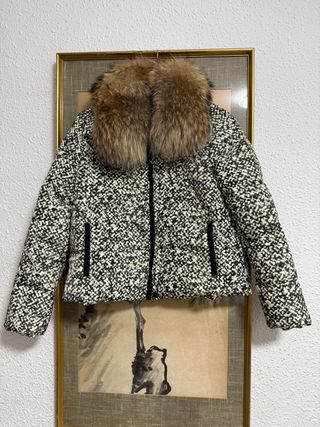 Elegante abrigo acolchado con un llamativo cuello de pelo. - Diseño tweed en blanco y negro. - Cierre de cremallera. - Bolsillos laterales.