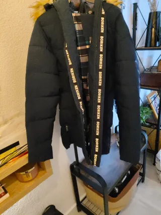 Chaqueta de invierno de la marca Boriken. - Color negro con detalles multicolor. - Diseño acolchado. - Capucha con pelo. - Cinta con logo en la solapa.