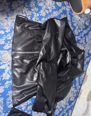 Chaqueta de cuero sintético con cuello forrado. - Cierre frontal con cremallera. - Bolsillos laterales con cremallera. - Puños con cremallera.
