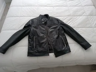 Chaqueta de cuero sintético con un diseño moderno y detalles acolchados en los hombros. - Cierre frontal con cremallera. - Dos bolsillos laterales con cremallera. - Cuello redondo con cierre de botón. - Puños con cremallera.