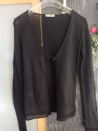chaqueta muy fina con un solo botón. es de entretenimiento verano. no pone talla pero será una M es negra y en perfecto estado