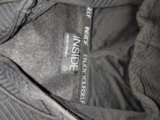Chaqueta negra de la marca Kiabi. Presenta un diseño moderno con una franja horizontal en el pecho. - Cierre de cremallera frontal. - Cuello redondo. - Manga larga.