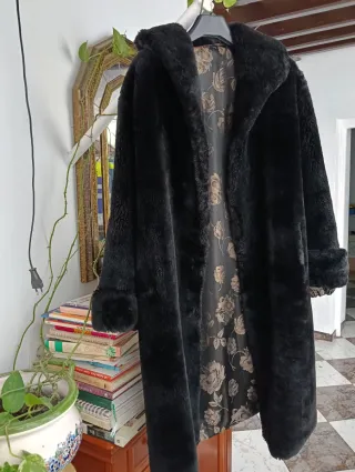 Elegante abrigo de pelo rizado. - Diseño clásico y atemporal. - Tacto suave y cálido. - Ideal para ocasiones especiales o para el día a día.