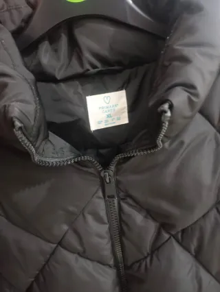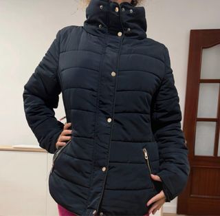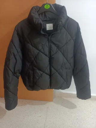 Chaquetón acolchado en color negro,sin uso; aunque la etiqueta indica otra talla, la talla real corresponde a L–XL. Es calentito, con cuello alto, cierre de cremallera y botones, y bolsillos con cremallera. Está en perfecto estado.