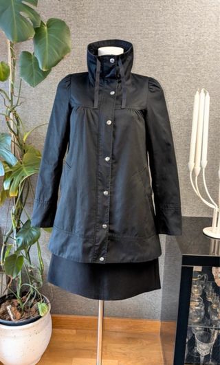 Elegante parka negra con un diseño moderno y funcional. Perfecta para añadir un toque sofisticado a tu vestuario. - Cuello alto con cierre de cordones. - Cierre frontal de botones. - Mangas abullonadas. - Bolsillos laterales.
