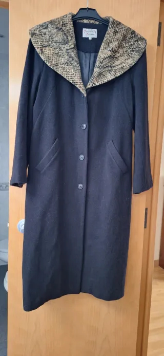 Elegante abrigo largo en color negro con un llamativo cuello estampado animal. - Diseño largo. - Cierre de botones. - Bolsillos laterales. - Cuello con estampado de serpiente o reptil.