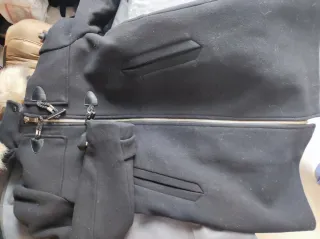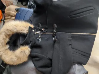 Abrigo de porteo de la marca Wombat & Co que también se puede llevar de forma habitual sin portear. Con cremallera por delante y por detrás para poder portear por ambos lados. Cordón ajustable en la cintura (el del lado izquierdo se ha descosido pero se puede coser). Lleva forro interior de pelo sintético tanto por dentro del abrigo como por la capucha (desmontable) y del accesorio para el cuello y porteo. Tejido repelente al agua y cortavientos. De no ser por los pequeños descosidos de los bolsillos (no es roto y se puede coser) está perfecto.