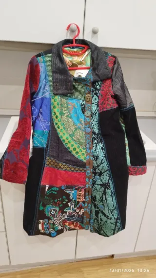 Abrigo de la marca Desigual con un diseño patchwork muy original y lleno de color. Perfecto para añadir un toque único a tus looks. - Diseño patchwork con diferentes tejidos y estampados. - Combinación de colores vibrantes sobre base negra. - Cuello solapa clásico. - Manga larga.