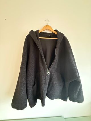 Abrigo largo con cremallera frontal y bolsillos. Tiene uso, pero está muy bien. Pone talla S, pero es más como una M pequeña. - Tejido rizado. - Diseño abierto en cuello. - Dos bolsillos frontales.