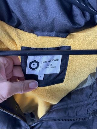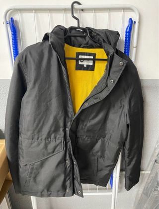 Chaqueta de la marca Jack & Jones con un llamativo forro interior. - Color exterior negro. - Forro interior de color amarillo. - Diseño con capucha. - Cierre de cremallera y botones a presión. Poco uso, como nueva