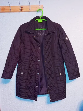 Chaqueta de boutique nueva. Se ha usado una o dos veces. Sin defectos Es abrigadora pero no pesa nada. El color es entre morado y granate