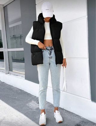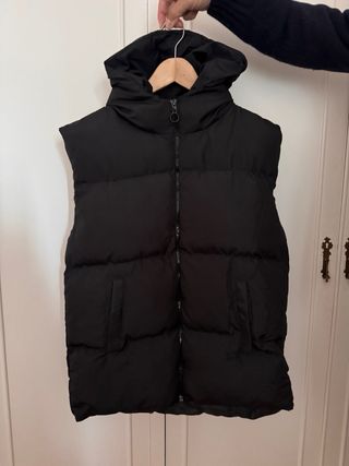 Chaleco negro con capucha, ideal para añadir una capa extra de abrigo. - Cierre de cremallera frontal. - Diseño acolchado. - Mangas sin mangas.