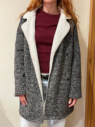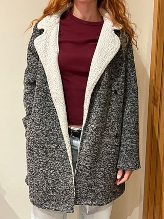 Abrigo de invierno con un diseño moderno y cálido. - Tejido exterior texturizado en gris y negro. - Forro interior blanco de borreguito. - Cuello solapa. - Cierre de un botón.