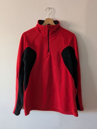 Chaqueta polar delgada y ligera, de cuello alto ✅ Ideal para senderismo o deporte ✅ Color rojo y negro ✅ Talla M, pero las medidas están indicadas en las fotos ✅ Cremallera frontal superior
