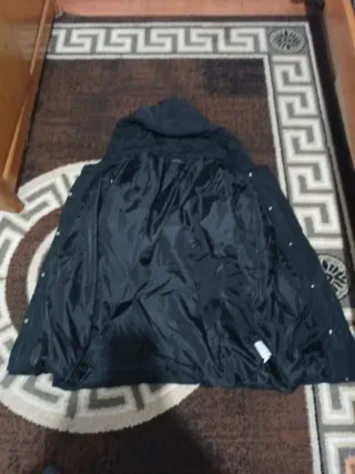 Abrigo negro con forro interior. - Cierre de cremallera. - Dos bolsillos frontales con solapa. - Cuello alto.