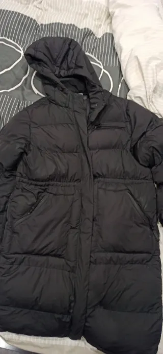 Abrigo acolchado largo negro de la línea Zara Basic, en talla XS. Es un modelo muy cómodo, calentito y práctico para invierno, ideal para uso diario. ✔️ Acolchado grueso y ligero ✔️ Largo a mitad del muslo (muy abrigado) ✔️ Puños y bajo de canalé, perfectos para mantener el calor ✔️ Capucha integrada ✔️ Cierre con cremallera + botones a presión ✔️ Bolsillos laterales con cierre ✔️ Usado, pero en buen estado general Perfecto para paseos, trabajo, clase o días de frío. Combina bien con leggings, jeans y botas. Un básico de invierno que nunca falla. Acepto ofertas razonables