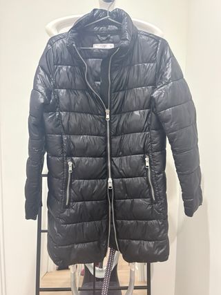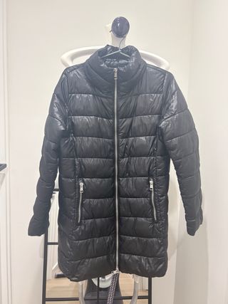 Abrigo plumífero largo de Mango, color negro, talla L. Estado como nuevo, muy poco uso, sin roces, manchas ni desperfectos. Cremalleras y botones en perfecto estado. Características: • Acolchado ligero y muy cálido • Cuello alto • Cierre frontal con cremallera • Bolsillos laterales con cremallera • Detalle de botones en puños • Corte recto, cómodo y estiliza Ideal para invierno y uso diario. Muy práctico y combinable. Se vende por no usar.