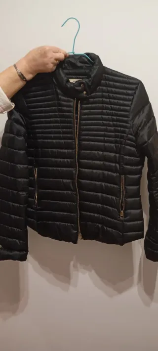 Vendo chaqueta acolchada ligera en color negro, ideal para entretiempo y días frescos. Diseño moderno con cremallera dorada y bolsillos laterales también con cierre. Cuello alto con botones a presión para mejor abrigo. Estado: Muy buen estado, sin daños visibles. Material: Acolchada, ligera y cómoda. Corte: Ajustado y femenino. Medida: de axila a axila 51 cm y de largo 66cm Perfecta para uso diario, trabajo o salir.