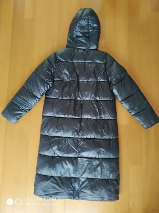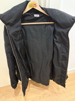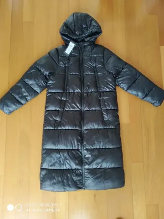 A estrenar abrigo largo de la marca ONLY en color negro. Es una prenda acolchada con capucha.