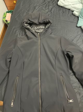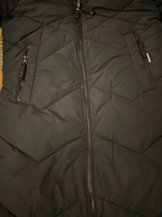 Abrigo negro de plumas con cinturón.Altura caderas - Capucha con pelo no desmontable - Cinturón con hebilla plateada. -2 bolsillos a los lados del cuerpo,otro en la manga izquierda y uno el interior. Todos con cierre de cremallera. -Abriga mucho(50% pluma y 50% plumón de pato) Es una talla 40 pero no es tan grande. Yo tengo una 36-38 y me queda bien con un jersey