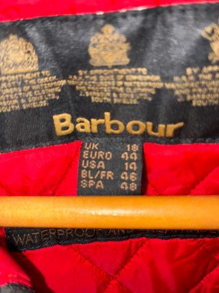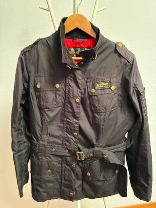 • Abrigo **Barbour International** vintage, modelo clásico con cinturón, inspirado en las chaquetas de moto británicas. • Exterior negro **waterproof & breathable**; interior acolchado rojo súper icónico y abrigado. • Detalles premium: botones dorados, cuello de pana, múltiples bolsillos y parche Barbour original. • Estado muy bueno: sin roturas ni manchas, desgaste mínimo propio del uso. • Perfecta para looks utility, preppy-british o street con toque heritage.