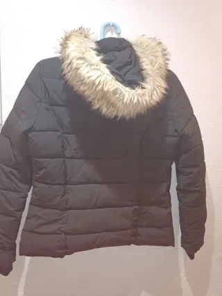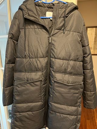 Abrigo acolchado de Zara con capucha. - Cierre de cremallera. - Bolsillos frontales con cremallera. - Detalle de pelo en la capucha.