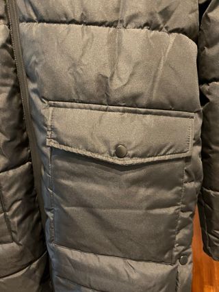 Abrigo de la marca Pull&Bear en color negro. Cuenta con capucha y un diseño moderno. - Cierre de botones y cremallera. - Bolsillos frontales. - Detalle de pelo en la capucha. - Puños ajustables.