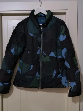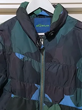 Abrigo tipo plumífero de la marca Skunkfunk con un diseño muy original. Talla 3 - Estampado llamativo en tonos negros, verdes y azules. - Cierre de cremallera frontal. - Cuello alto.