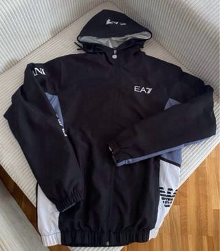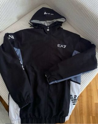 Chaqueta deportiva con capucha de la marca EA7. Talla L y se queda ajustada como M - Diseño en color negro con detalles en blanco y gris. - Logo de EA7 en la parte frontal. - Capucha ajustable con cordones.