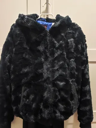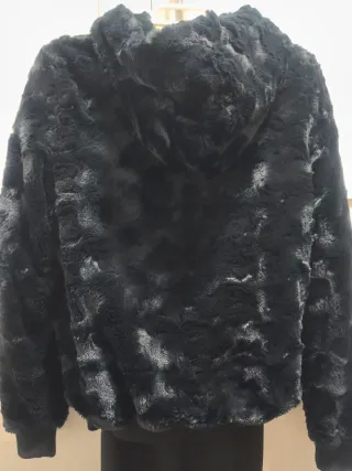 Bonita chaqueta con acabado de pelo sintético. Es cómoda y tiene un diseño moderno.Talla pequeña,para una M perfecto ,Puños y bajo de lana, súper abrigada - Capucha integrada. - Cierre de cremallera. - Bolsillos laterales.