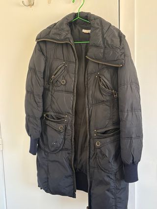 Abrigo acolchado largo de Lefties (modelo antiguo), ideal para el invierno. Tiene un corte recto y cómodo con acolchado uniforme que aporta buen abrigo. El cuello alto integrado protege del frío y del viento. Cuenta con cierre frontal con cremallera completa, varios bolsillos con cremallera y detalles metálicos y puños elásticos para un mejor ajuste. Tejido exterior mate, fácil de combinar con looks diarios. 🔹 Marca: Lefties 🔹 Talla: M 🔹 Color: negro 📌 Estado: buen estado 📦 Listo para envío