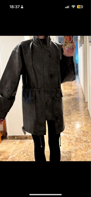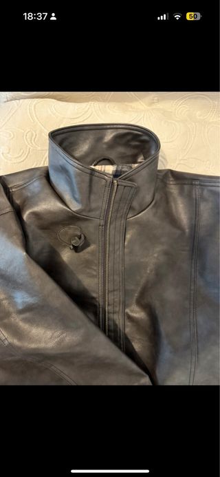 Cazadora de piel en color negro. Diseño moderno y versátil. - Cierre con cremallera y botones. - Bolsillos frontales con solapa. - Cintura ajustable con cordón. - Cuello alto. Cazadora de cuero vintage talla S. Agotada en existencias. Comprada hace 3 meses sin estrenar. Super preciosa pero no puedo quedármela. Mangas abullonadas. Cierre en trenca, con corchetes, cuello redondo, ajustable en cintura y al final con cordones. El precio lo ajusto un poquillo, porque esta nueva sin estrenar.