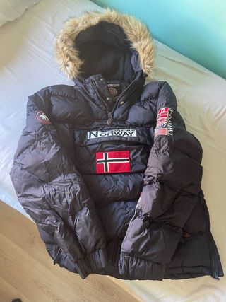 Chaqueta de la marca Geographical Norway en color negro con detalles multicolor. - Capucha con pelo. - Bolsillo frontal. - Parches decorativos.