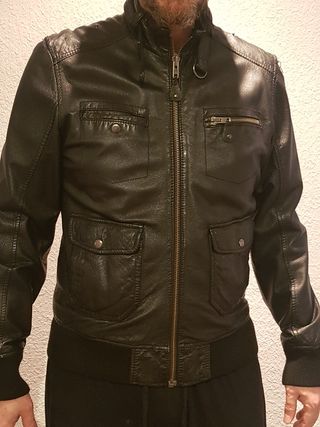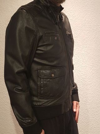 Cuero 100 %.Talla L. Color negro. Tiene 4 bolsillos delanteros. Puños y parte inferior de lana. Los hombros estan un poco descosidos en la parte superior, se ve en las fotos